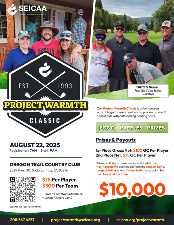 Team registration fees include an 18-hole round of golf, a goody bag, breakfast and lunch for you, and more. To register your team, please complete a Team Registration Form – available at SEICAA’s Caribou County office (159 E. 2nd S.) and online at https://seicaa.org/projectwarmth/ – and submit it with payment by August 7, 2025. You may drop off your Team Registration form at SEICAA’s Caribou County office or email it to projectwarmth@seicaa.org. If you are bringing one or more guests, please add their name(s) on the Team Registration Form and include payment for their meal(s).